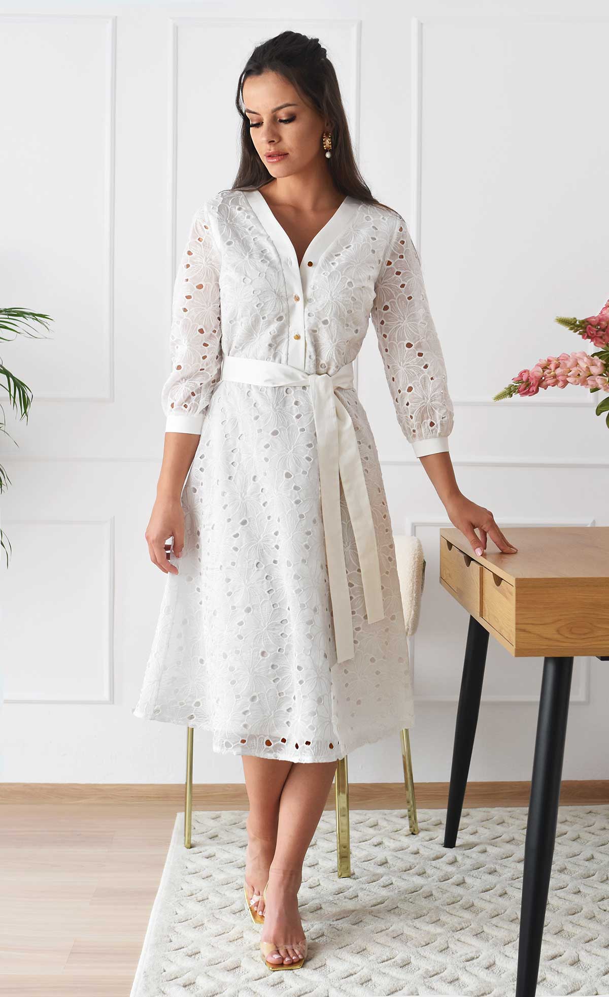 Cała sukienka jest zdobiona ażurowym białym haftem w kwiaty, który prezentuje się niezwykle efektownie. Oktawia z pewnością przyciągnie uwagę swoim unikalnym wzorem. Jest kwintesencją stylu i elegancji.